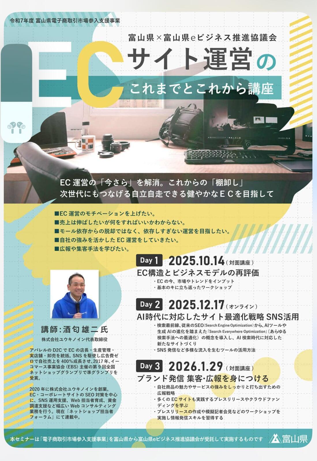 【開催日時】Day1:2025年10月14日(火) 16:00~18:00(受付15:30~)※対面開催Day2:2025年12月17日(水) 16:00~18:00 ※オンライン開催Day3:2026年01月29日(木) 16:00~18:00(受付15:30~)※対面開催【参加費】無料【開催形態】Day1&Day3:オフライン(対面)開催Day2:オンライン開催【開催会場】Day1:富山県民会館 5階509号室Day2:オンライン開催Day3:富山県民会館 7階702号室【開催内容】▶Day1 EC構造とビジネスモデルの再評価・ECの今、市場やトレンドをインプット・基本の上に立ったワークショップ▷講師:株式会社ユウキノイン代表取締役 酒匂 雄二氏▷懇親会あり(講師参加)▶Day2 AI時代に対応したサイト最適化戦略 SNS活用・検索最前線「変革のSEO(Search Engine Optimization)」から、AIツールや生成AIの進化を踏まえた「Search Everywhere Optimization」(あらゆる検索先への最適 化)の概念を導入し、AI検索時代に対応したサイト構造を学ぶ。・SNS発信など多様な流入を生むツールの活用方法▶Day3 ブランド発信 集客・広報を身につける・自社商品の魅力やサービスの強みをしっかりと打ち出すための文章戦略・手元のECサイトも実践するプレスリリースやクラウドファンディングを学ぶ。・プレスリリースの作成や模擬記者会見などのワークショップを実施し情報発信スキルを習得する▷講師:株式会社ユウキノイン代表取締役 酒匂 雄二氏▷懇親会あり(講師参加)【申込】下記のチラシ申込みフォーム(QRコード)から▼WEBお申込みフォームはこちら※上記は予定です。セミナー内容・登壇者は変更になる可能性がございます【お問い合わせ先】